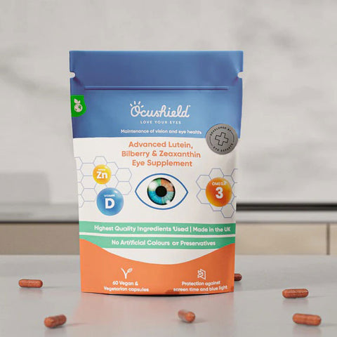Ocushield Advance 360 eye supplement contains natural herbal extracts like lutein, zeaxanthin and bilberry which are all naturally occurring, powerful antioxidants that build up and protect the retina at the back of the eye. The Ocushield Advance 360 eye supplement also contains natural vegan algae oil (a source of omega 3), zinc oxide and vitamin D which all help to maintain normal vision.