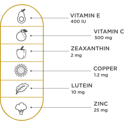 Vitamin C, vitamin E, gelatin (bovine), glycerin, soybean oil, soy lecithin, colour: yellow beeswax, lutein, zinc oxide, zeaxanthin, colour: caramel & annatto, sunflower oil, copper oxide