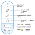 Viteyes 2 Advanced offers an enhanced combination of vitamins and minerals for eye health. It contains a formula in line with that recommended by pivotal eye health research at the United States National Eye Institute (AREDS2) with the addition of other key anti-oxidants. It provides a high dose of vitamins C & E, zinc, copper as well as 10mg of lutein, 2mg of zeaxanthin, bilberry extract, grape seed extract, alpha lipoic acid and selenium.