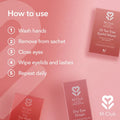- CLEANSE with M-Club Tea tree oil eyelid wipes to remove dirt and debris from the eyelids & lashes