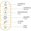 Vitamin C, vitamin E, gelatin (bovine), glycerin, soybean oil, soy lecithin, colour: yellow beeswax, lutein, zinc oxide, zeaxanthin, colour: caramel & annatto, sunflower oil, copper oxide